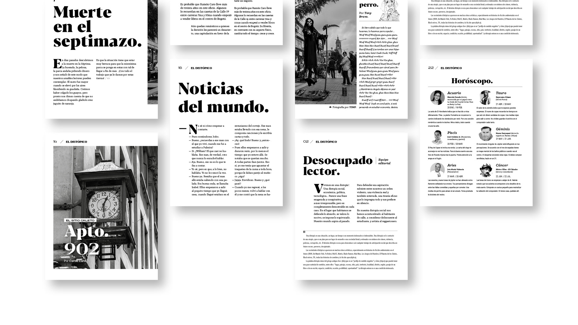 El proyecto se dividió en dos grandes partes: la identidad de marca y el diseño editorial, para fortuna de El Distópico, nuestros grandes fuertes. La identidad debía reunir el ADN de la publicación: una publicación sarcástica sin ninguna intención de parecerlo pero con muchos méritos para acreditarlo, por lo que nos enfocamos en conseguir un logotipo pesado, con aire clásico pero con esencia más moderna, aplicable tanto el entorno impreso como en el digital.