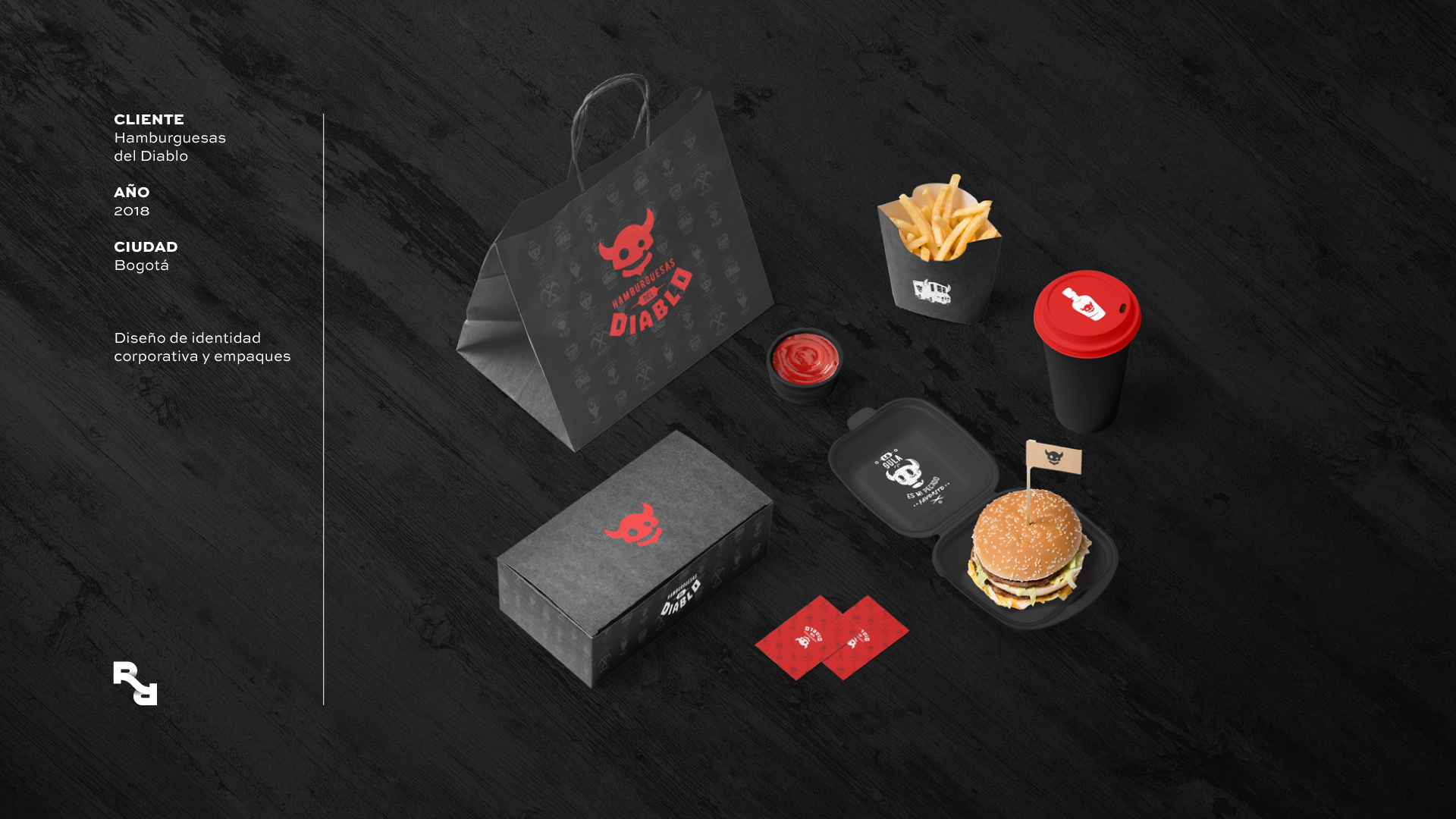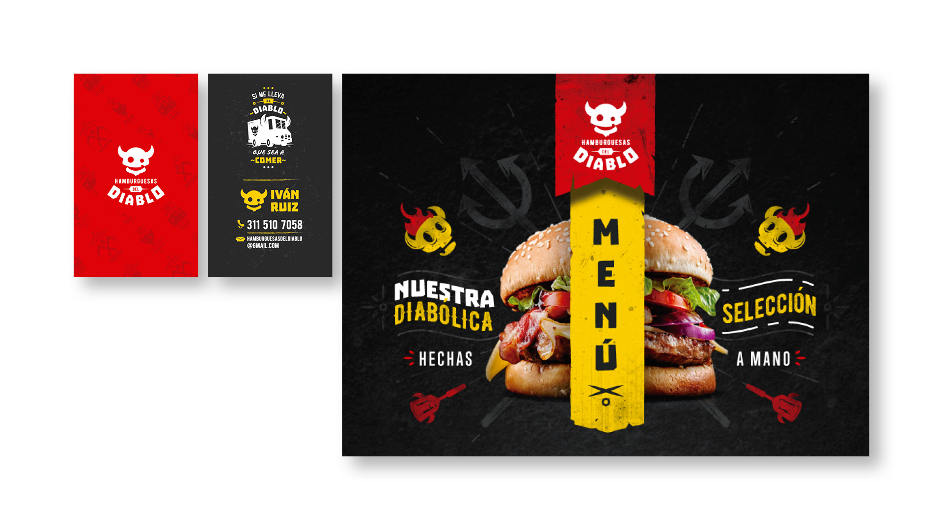 Para el abordaje de la marca teníamos que lidiar con la mala imagen que tiene el nombre, El Diablo. Limpiar su imagen, alejarlo de concepciones y convencionalismos religiosos y dotarlo de una personalidad amable, rockera y divertida que atrajera a los clientes a disfrutar de su sazón. Y lo conseguimos. El diablo ya no parece tan malo como su nombre, creamos un símbolo divertido, producto de la abstracción de la hamburguesa y el rostro más reconocido del diablo con sus característicos cuernos, lo acompañamos de un conjunto de tipografías con mucha personalidad, robustas pero de corte casual. Por último, creamos una serie de ilustraciones que se convierten en un pattern presente en la identidad visual de la marca y que en conjunto con los otros elementos visuales promulgan los valores de esta marca que aunque salida del mismo infierno, promete llevar al cielo los paladares de quienes se atreven a disfrutarla.
