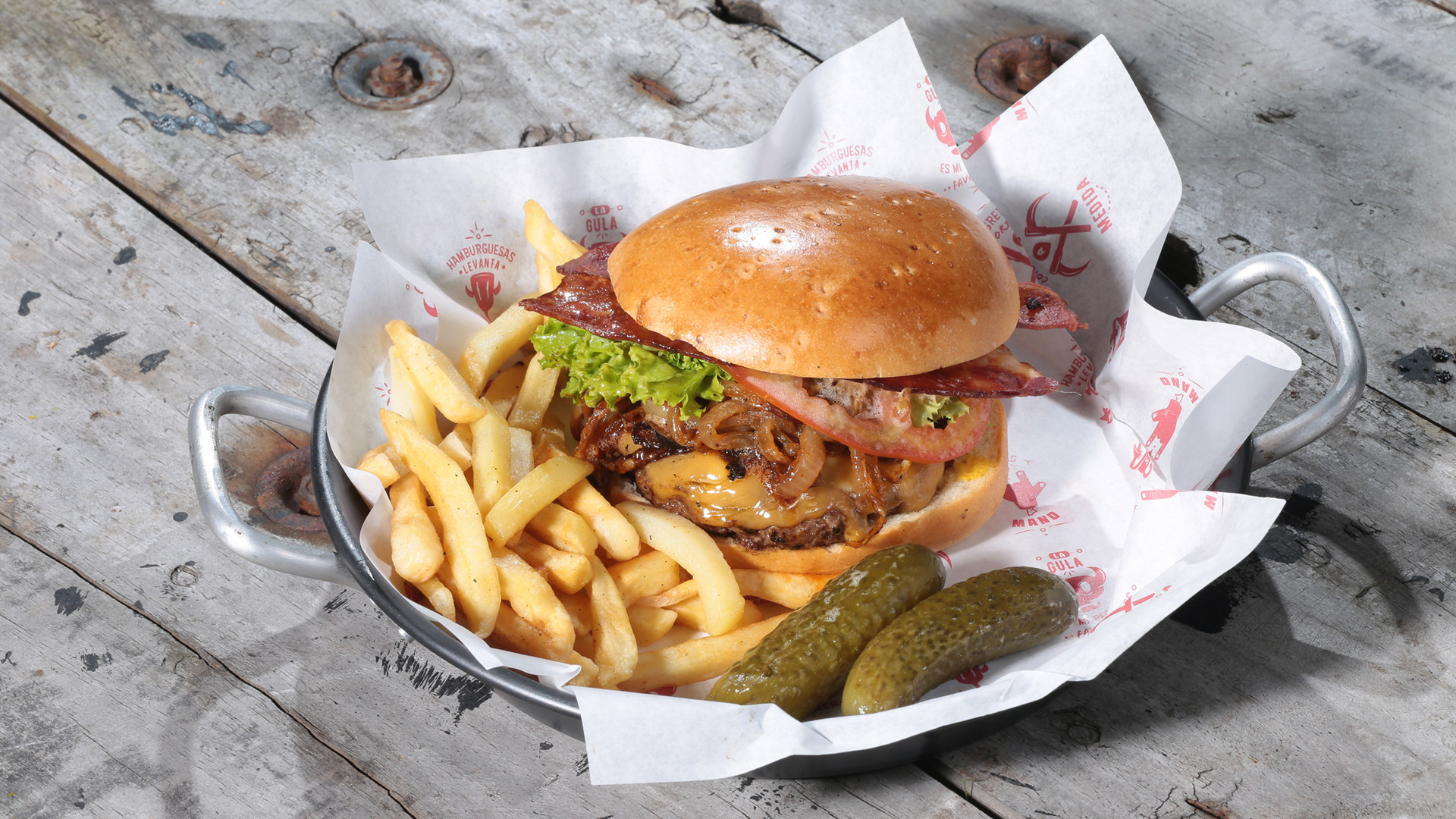 Presentación del producto servido. Acompañado de papas fritas y pepinillos